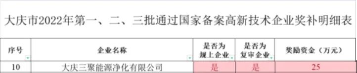 根據(jù)《中共黑龍江省委辦公廳 黑龍江省人民政府辦公廳關(guān)于印發(fā)<新時(shí)代龍江人才振興60條>的通知》文件精神,大慶市科學(xué)技術(shù)局近日將大慶市2022年第一、二、三批通過(guò)國(guó)家備案的高新技術(shù)企業(yè)獎(jiǎng)補(bǔ)名單及獎(jiǎng)補(bǔ)金額予以公示。海國(guó)投旗下海新能科所屬企業(yè)大慶三聚公司獲得25萬(wàn)元獎(jiǎng)補(bǔ)資金。