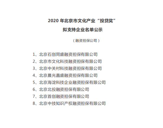 根據(jù)《北京市實施文化創(chuàng)意產(chǎn)業(yè)“投貸獎”聯(lián)動推動文化金融融合發(fā)展管理辦法(試行)》(京文領(lǐng)辦文〔2017〕3號)、《文化創(chuàng)意產(chǎn)業(yè)“投貸獎”聯(lián)動政策金融機構(gòu)考核獎勵實施細(xì)則》(京財科文〔2019〕2343號)及《關(guān)于集中審核北京市文化產(chǎn)業(yè)“投貸獎”支持資金申報項目的通知》,12月10日,北京市國有文化資產(chǎn)管理中心對2020年“投貸獎”資金擬支持名單進行了公示。此次進入名單公示的文化企業(yè)、金融機構(gòu)共899家,其中8家融資擔(dān)保機構(gòu),北京中技知識產(chǎn)權(quán)融資擔(dān)保有限公司名列其中。